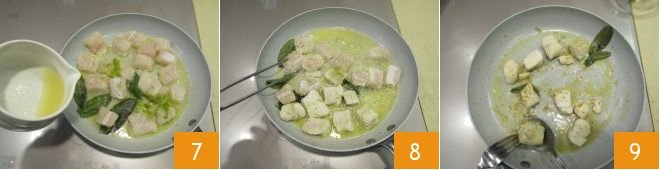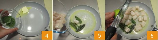 Now move on to the seasoning: in a non-stick pan, melt the butter and add the sage leaves 4. Once the butter has melted, gently add the hake bites 5, then grate half of the lime zest 6.