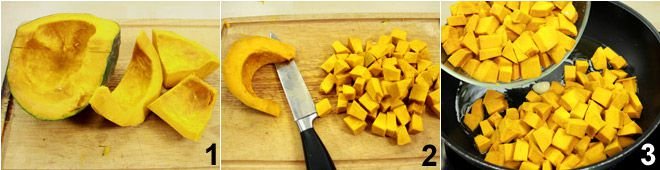 To prepare the sautéed pumpkin with rosemary and white wine, start by cutting the pumpkin into pieces and removing the skin 1. Then take the pumpkin flesh obtained and cut it into chunks the size of a walnut 2. Place the oil in a pan, and let the garlic cloves (1-2 as preferred) turn golden; once golden, you can choose to remove them or leave them in the pan. Add the pumpkin pieces 3