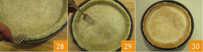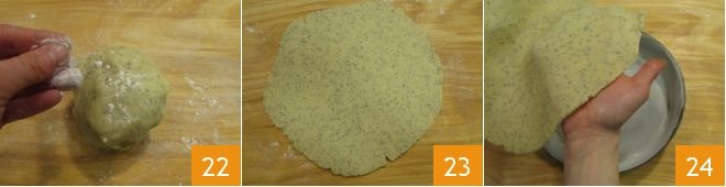 In the meantime, retrieve the shortcrust pastry, divide it in half, wrap the half you are not using immediately with plastic wrap, and set it aside; flour the part to be rolled out 22 and roll it out with a rolling pin on a work surface, obtaining a disk 1/3 inch thick 23. Butter and flour a 9-inch diameter pie pan, place the first disk in the mold 24, adhering well to the bottom and sides.
