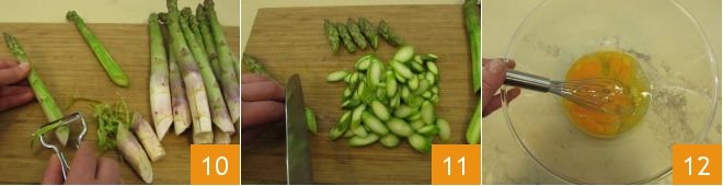 In the meantime, focus on the filling. How to clean asparagus: wash them and cut off the lighter, woody end of the stalk, and peel the asparagus with a peeler to remove the tough outer skin 10. Then cut the stalk into diagonal slices, keeping the tips aside for decoration 11. In a bowl, beat the eggs with a whisk 12