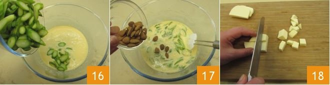 and add only the asparagus slices (not the tips) 16. Also add whole almonds 17, cut the scamorza cheese into cubes 18