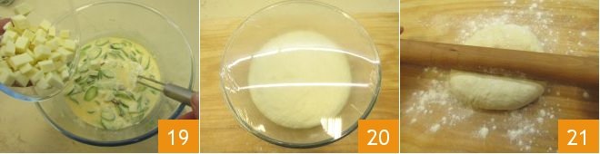 and add it to the filling 19. Mix to combine all the ingredients and set aside. Now take your risen dough 20, roll it out with a rolling pin on a floured surface 21,