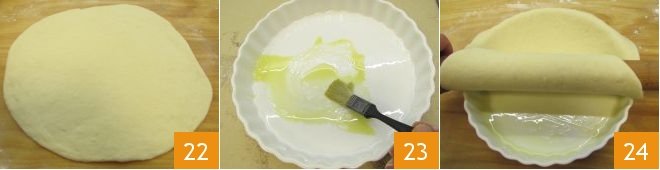 you need to obtain a round sheet about 12-14 inches in diameter, thin enough to cover the bottom and sides of the pie pan 22. Take a baking pan measuring 10.8 inches in diameter (measured across the surface), grease it well 23, then roll the dough onto the rolling pin and unroll it over the pie pan 24.