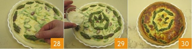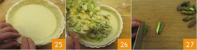 With a gentle pressure of your fingers, press the dough into the pan without trimming the edges 25. Pour the filling into the pie pan 26, distribute it evenly with the back of a spoon, and then cut the asparagus tips you set aside in half lengthwise 27