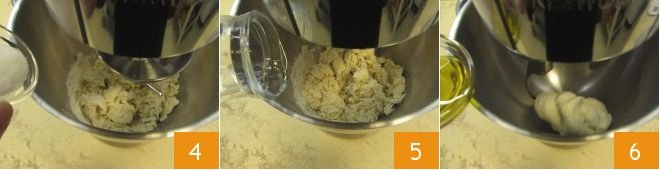 add the salt 4. Then pour in the remaining half of the water 5 to help dissolve the salt well. Continue kneading until you obtain a smooth and elastic dough that detaches from the sides of the mixer bowl. At this point, gradually add the oil 6, keeping the mixer running.