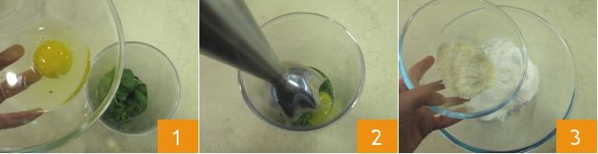 To make the savory basil cookies, first place the washed and dried basil leaves in a tall glass, add an egg 1 and blend everything with the immersion blender 2 to obtain a cream that you will set aside. In a bowl, pour the flour and grated cheese 3.