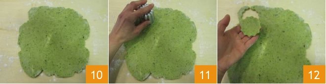 When you have obtained a sheet about 1/4 inch thick 10, cut out the cookies with a cutter approximately 2 inches in diameter 11: we used a cutter with fluted edges 12. By re-kneading the scraps, you will get a total of about 35-36 cookies.