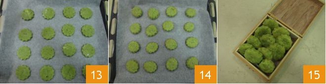 Place the cookies on a baking sheet lined with parchment paper 13 and bake in a preheated static oven at 350°F for 25 minutes. Once baking is complete, remove the savory basil cookies 14, let them cool, and then serve them 15!