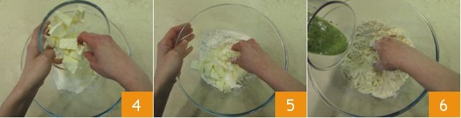 Add the cold butter cut into cubes 4. Crumble the mixture with your fingers 5, then pour in the previously prepared basil cream 6.