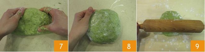 Knead by hand, gathering all the ingredients, then transfer the dough to a work surface 7 and compact it well. Wrap the dough with plastic wrap 8 and place it in the refrigerator for 20 minutes. After the resting time, take the dough and roll it out with a rolling pin on a lightly floured work surface 9.