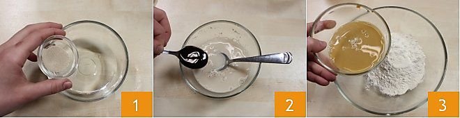 To prepare the savory beer angelica, first make the starter: dissolve the active dry yeast (alternatively, you can use 12 g of fresh yeast) in lukewarm water by stirring with a teaspoon 1; then add the barley malt (or sugar) 2 and, still stirring, dissolve it. In a bowl, place the flour you have previously sifted, add the yeast and malt mixture 3, and mix all the ingredients until combined.