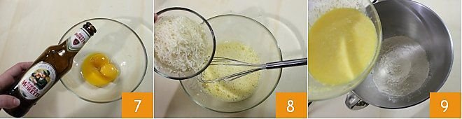 In a bowl, beat the eggs together with the beer 7, then add the Parmesan 8, salt, and mix everything. Take a stand mixer fitted with the paddle attachment, place the sifted flour inside, transfer the egg mixture into the mixer 9 (if you don't have a stand mixer, place the ingredients in a bowl and knead by hand).