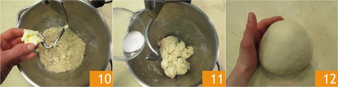 Knead until the ingredients are combined and then gradually add the butter 10. Once combined, add the salt 11 and knead until fully absorbed. Work for a few seconds with your hands, rolling into a round dough ball 12.