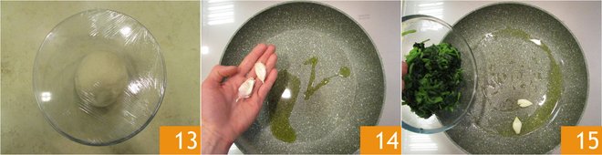 Place in a bowl and cover with plastic wrap 13. Let rise at around 79°F for 1 hour. In the meantime, heat the oil in a pan, add the garlic cloves 14, and then the friarielli 15, sauté for a few minutes.