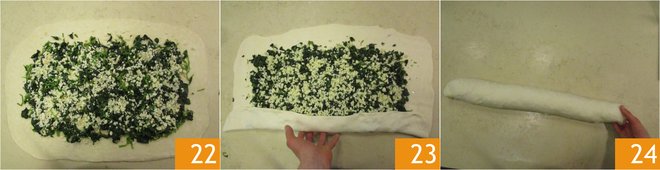Add the provola as well 22. Roll it up, following the long side 23, ensuring the filling doesn't come out, seal the edges 24 and place in the fridge to set for about 30 minutes.