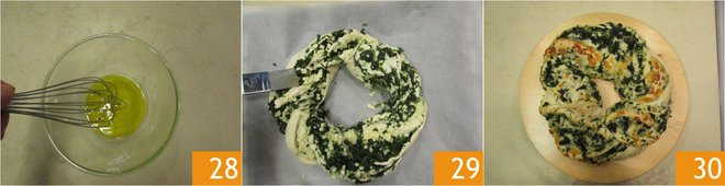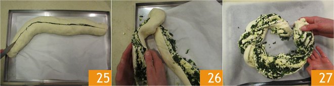 Lay the roll on a baking sheet lined with parchment paper, make a cut along the long side 25, keeping one end intact, twist the two ends placing one over the other and keeping the filling facing up 26. Finish the twist by forming a sort of bundt by attaching the two ends pressing with your fingers 27.