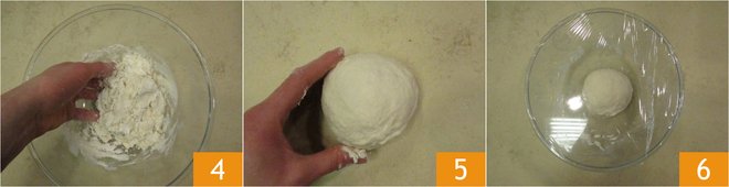 Knead with your hands 4. Move to the work surface and form a round dough ball 5, place it in the bowl, cover with plastic wrap 6. Let it rise for 1 hour at room temperature or in an off oven at about 79°F, until the dough doubles in size.