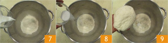 Pour into the stand mixer with the dough hook the all-purpose flour, milk 7, sugar 8, and the previously risen dough 9.