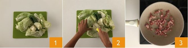 To prepare the savory cabbage pie, first wash the Savoy cabbage leaves and lay them on a cutting board 1. Then cut them into fairly small pieces 2 and set them aside. In a pan, place the diced bacon 3
