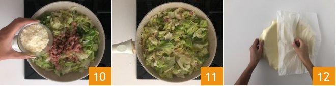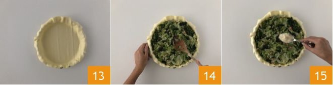 Make sure the pastry adheres well to the mold 13, transfer the cabbage inside, and press it gently with a wooden spoon 14. Sprinkle with the remaining grated cheese 15.