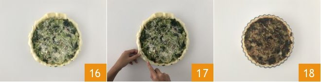 At this point 16, press the edge of the pastry with your finger to imprint a decoration 17. Bake in a preheated ventilated oven at 350°F for 30 minutes. Remove from the oven and serve your savory cabbage pie 18.
