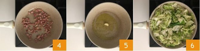and let it brown 4, without adding any other fats. Transfer it to a small plate and in the same pan, heat 2 tablespoons of oil with a clove of garlic 5. Let the garlic brown, then remove it and add the cabbage 6.