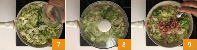 Add half a glass of water 7, salt, and cover the pan with a lid 8. Let it cook for 5 minutes, then add the browned bacon and black pepper 9.