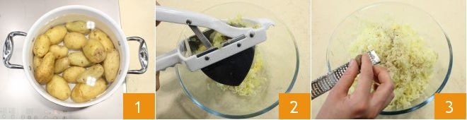 To make the savory cassata, start with the base dough: boil the potatoes in plenty of water 1, then, while still hot, mash them with a potato masher 2 and flavor with grated nutmeg 3,