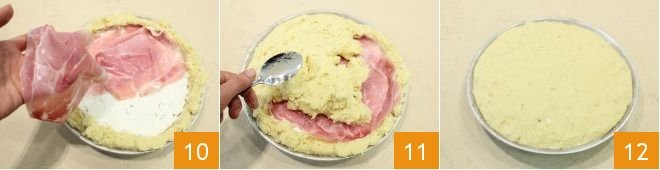 and then fill the cassata with a layer of ricotta cream, level the surface with the back of a spoon, and lay the slices of ham on top 10. Cover with the remaining half of the mashed potatoes, level the surface with the back of a spoon (11-12), and let it firm up in the fridge for at least 3 hours.