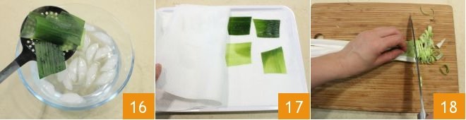 and put them in ice water to cool and keep the color vibrant 16. Then drain them and dry them with a paper towel 17. Thinly slice the lighter part of the leek 18