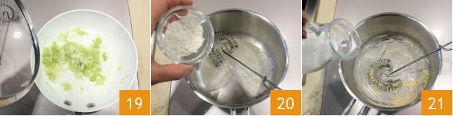 and sauté it over low heat in a pan with a touch of oil for 5 minutes to soften 19. Prepare the Béchamel sauce: in a small pot, melt the butter over low heat, then incorporate the sifted flour 20 and stir to create the roux, blend with the hot milk 21