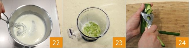 and continue to stir over low heat to thicken the sauce 22. Transfer the béchamel to a narrow container, add the sautéed leeks 23, and blend with an immersion blender to obtain a homogeneous cream, strain it to make it smooth, and set aside to cool covered with plastic wrap. Meanwhile, prepare the decorations: wash and trim the zucchini, slice them with a vegetable peeler lengthwise to obtain thin strips 24, set aside the outer slices with the skin