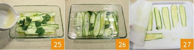 and place the rest in a baking dish, season with oil, lemon juice 25, salt, pepper, basil, and mint, cover with plastic wrap 26, and let them marinate for at least 30 minutes in the refrigerator. After the marinating time, drain the zucchini and dry them with a paper towel 27.