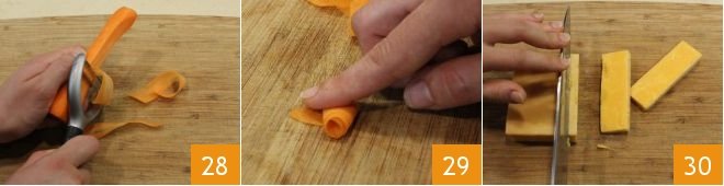 Then take care of the carrots: peel and slice them thinly with a vegetable peeler lengthwise to obtain thin strips as you did with the zucchini 28. Roll up 15 carrot strips to make small roses 29. Keep aside another 8 strips that will serve as petals. Slice the cheddar 30 and then cut small diamonds from these slices.