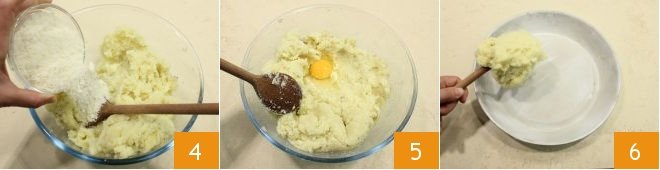 grated Parmesan cheese 4, and add the eggs, season with salt and pepper, and mix with a spoon to combine the dough 5 (it's important that the potatoes are very hot at this step so the egg doesn't remain raw). Butter and flour a cassata pan with a diameter of 11 inches and place half of the potato dough in the pan 6,