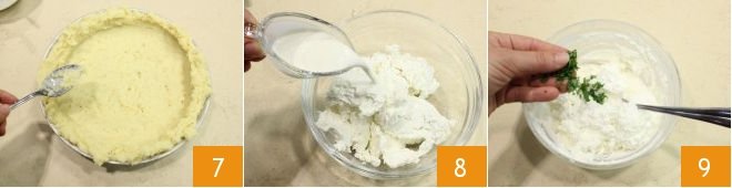 press the mixture on the bottom and around the entire edge 7. Prepare the filling: soften the ricotta with the cream 8, scent with chopped basil leaves 9