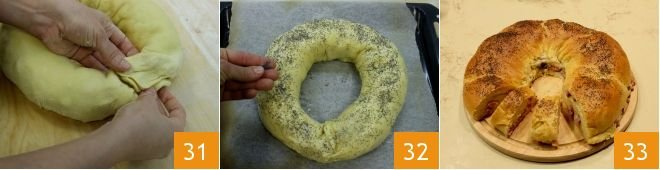 Make them adhere 31 and seal the edges well so that it results in a well-closed ring. Carefully place the ring on a baking sheet lined with parchment paper, brush the surface with beaten egg, and sprinkle it with poppy seeds 32, and let it rise for another hour at room temperature. Then bake the savory ring in a preheated static oven at 356°F for 40 minutes (320°F for 30-35 minutes if using a convection oven). When the ring is cooked, take it out, let it cool slightly, and serve it sliced 33!