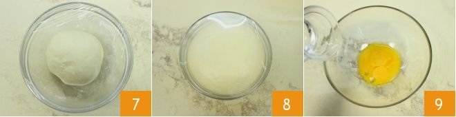 Place the starter in a bowl and cover it with plastic wrap 7; let it rise for about an hour in the turned-off oven with the light on until it doubles in volume 8. After the necessary time, in a bowl, pour the egg yolks and add the water at room temperature 9.