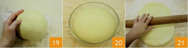 Transfer the dough to a floured work surface or pastry board and work it with your hands until you get a smooth and homogeneous ball 19. Place the dough in a bowl and cover it with plastic wrap; let it rise in a turned-off oven with the light on for 2 hours until the dough doubles in volume 20. After the required time, take the dough, place it on a floured surface or pastry board, and roll it out with a rolling pin 21 until it reaches a thickness of about 1/5 inch, trying to obtain a rectangular sheet.