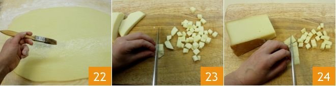 Brush the obtained sheet with extra virgin olive oil 21. Then prepare the filling: prepare slices of Emmenthal, cubes of sweet bacon; chop the sage and cut the provolone 23 and fontina 24 into cubes.