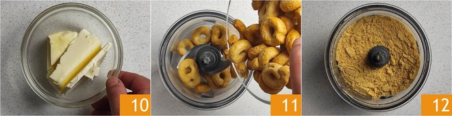 To prepare the base, melt the butter 10, either in the microwave or in a pan on low flame. Put the taralli in a food processor 11 and blend them to a powder 12.