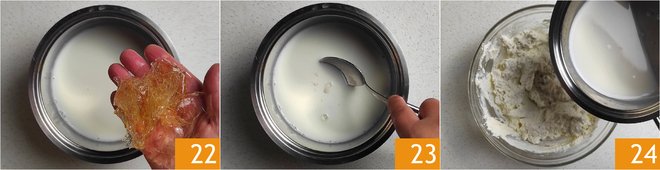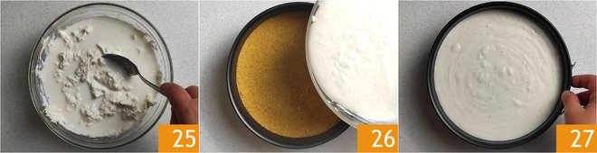 Mix 25 until you get a fairly liquid and homogeneous cream. Take the mold out of the refrigerator and pour the cream onto the base 26, tilt the mold to level the cream 27 and place it back in the refrigerator for an hour.