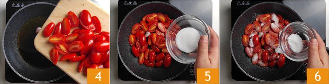 Place the cherry tomatoes in the pan 4, add the sugar 5, distributing it evenly over all the cherry tomatoes, and adjust the salt 6.