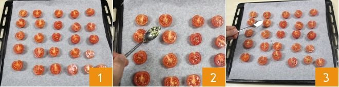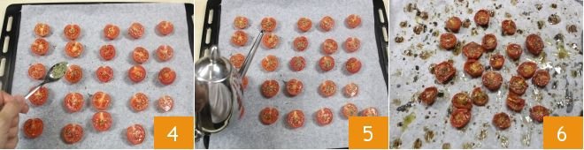 Continue by adding a sprinkle of dried oregano 4 and drizzle a little olive oil over each tomato 5. Then bake in a preheated ventilated oven at 284°F for about 2 hours, until they are slightly roasted but not dry 6. To learn how to best cook and store confit cherry tomatoes, consult the recipe: confit cherry tomatoes.