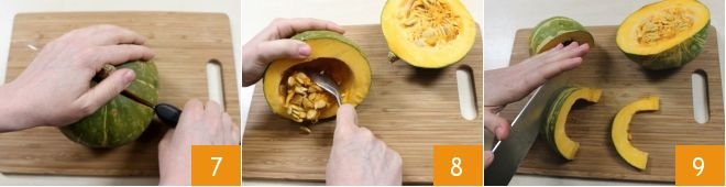 In the meantime, prepare the pumpkin: place the delica pumpkin on a cutting board and cut it in half 7. Then remove its seeds with a spoon 8 and slice it into 0.8-inch thick slices lengthwise 9. The smaller size of the delica pumpkin allows for smaller slices that resemble peach wedges.