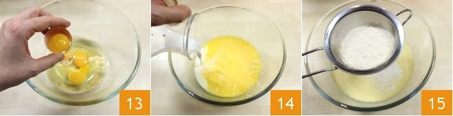 While the pumpkin is baking, prepare the clafoutis batter: crack the eggs into a large bowl 13 and beat them with a whisk, add the milk 14 and also add the flour sifted with a sieve directly into the mixture 15.