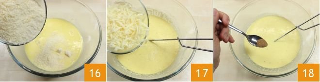 Also add the Parmesan and Emmentaler, which you have previously grated (16-17). Salt and pepper to taste, add the ground nutmeg 18, and mix everything together.