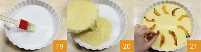 At this point, butter the bottom and sides of a round 10-inch pan, using a brush 19 and pour the mixture inside it 20. Now start placing the baked and cooled pumpkin slices. Try arranging them in a wheellike pattern, as if they were peaches 21, and if they are too long, cut them in half.