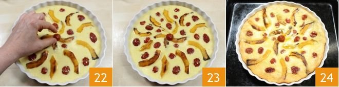 Add the confit cherry tomatoes between the pumpkin spokes you created, as if they were cherries, placing them with the cut side down 22. Once you've decorated the clafoutis gracefully, just as if it were a cake, with all the pumpkin slices and confit cherry tomatoes 23, bake in a preheated static oven at 356°F for about 40 minutes, if using a ventilated oven, bake at 320°F for about 30 minutes. When the surface is pleasantly golden 24, take the savory clafoutis out of the oven, let it cool slightly and serve it as an appetizer or main course!