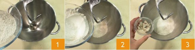 To prepare the savory colomba, start by making the dough. Pour the whole wheat flour 1, the all-purpose flour 2, and the bread flour 3 into the bowl of a stand mixer fitted with a hook attachment. Add the crumbled yeast 3,